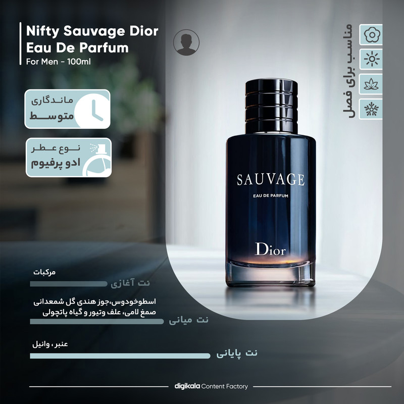 ادو پرفیوم مردانه نیفتی مدل ساواج دیور با حجم 100 میلی لیتر، عطری با بوی تند و خنک است که ترکیبی از فلفل سیچوان، نارنج و کهربا را ارائه میدهد. این عطر، که از مواد اولیه گیاهی، حیوانی و شیمیایی تهیه شده، برای استفاده روزانه و هدیه دادن مناسب است. نتهای آغازین آن شامل نارنج و مرکبات، با نتهای میانی اسطوخودوس، جوز هندی، گل شمعدانی و پاتچولی، و نتهای پایانی عنبر و وانیل است. این عطر برای تمام فصول مناسب است و نسبت به نسخه 60 میلی لیتری آن مقرون به صرفهتر است. ادو پرفیوم مردانه نیفتی مدل ساواج دیور با حجم 100 میلی لیتر، با رایحهای اغوا کننده، انتخابی ایدهآل برای افرادی است که به دنبال عطری خاص و منحصر به فرد هستند.